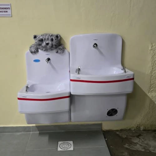 Os bebedouros infantis são projetados com altura adequada para que as crianças consigam alcançar a torneira e se servir de água de forma independente.